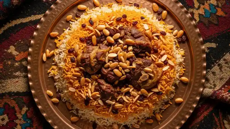 Kabsa is traditionally served on a large communal platter. The meat is placed on top of the rice, and everyone gathers around to eat together—a true symbol of unity and hospitality.